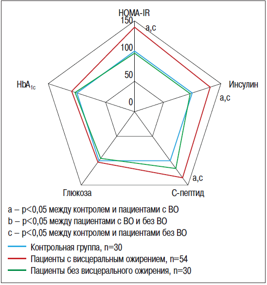 3. Рис. 3. Показатели углеводного обмена больных ИБС в зависимости от наличия висцерального ожирения | |
