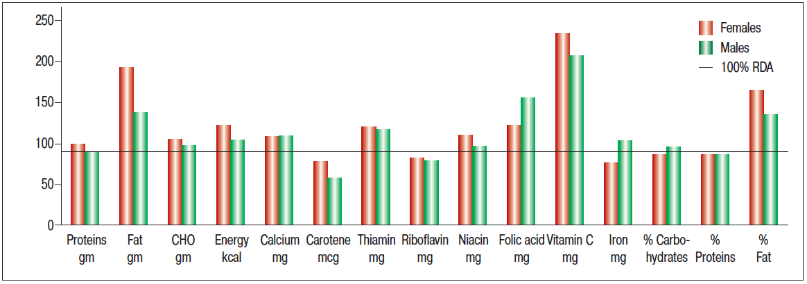 Рис. 1. Потребление энергии и питательных веществ участниками исследования мужского и женского пола, в процентах от рекомендуемой суточной нормы.