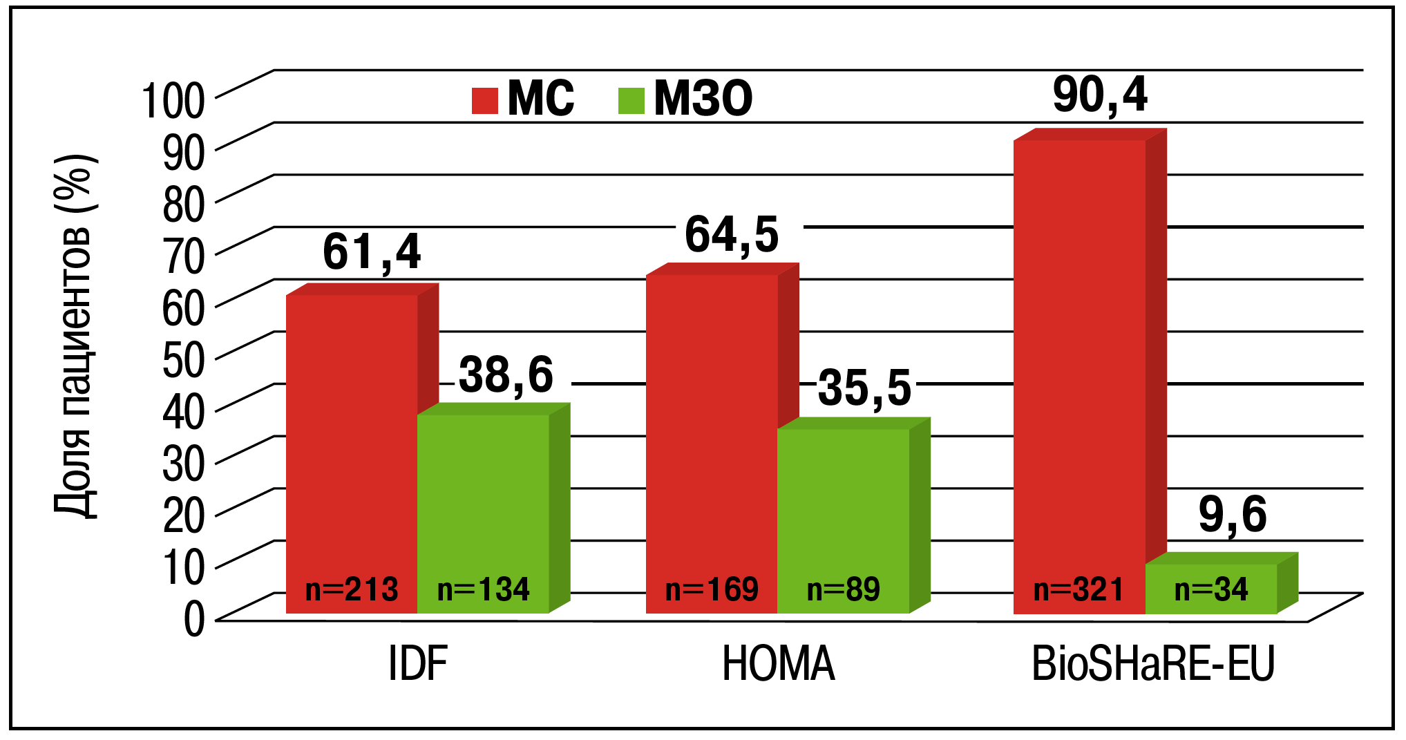 Распространенность МЗО с учетом критериев IDF 2005 г. составила 38,6%, по индексу НОМА-IR – 35,5%, по BioSHaRE-EU – 9,6% (рис. 1).