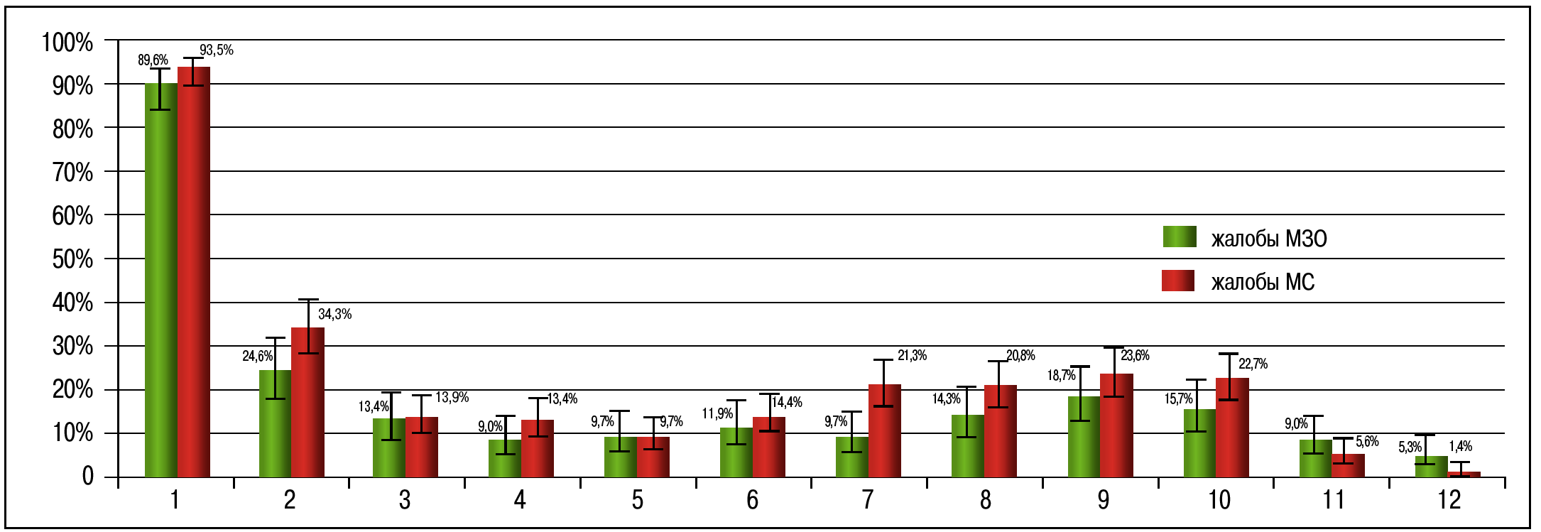 Рис. 2. Частота жалоб пациенток в группе МЗО и МС.