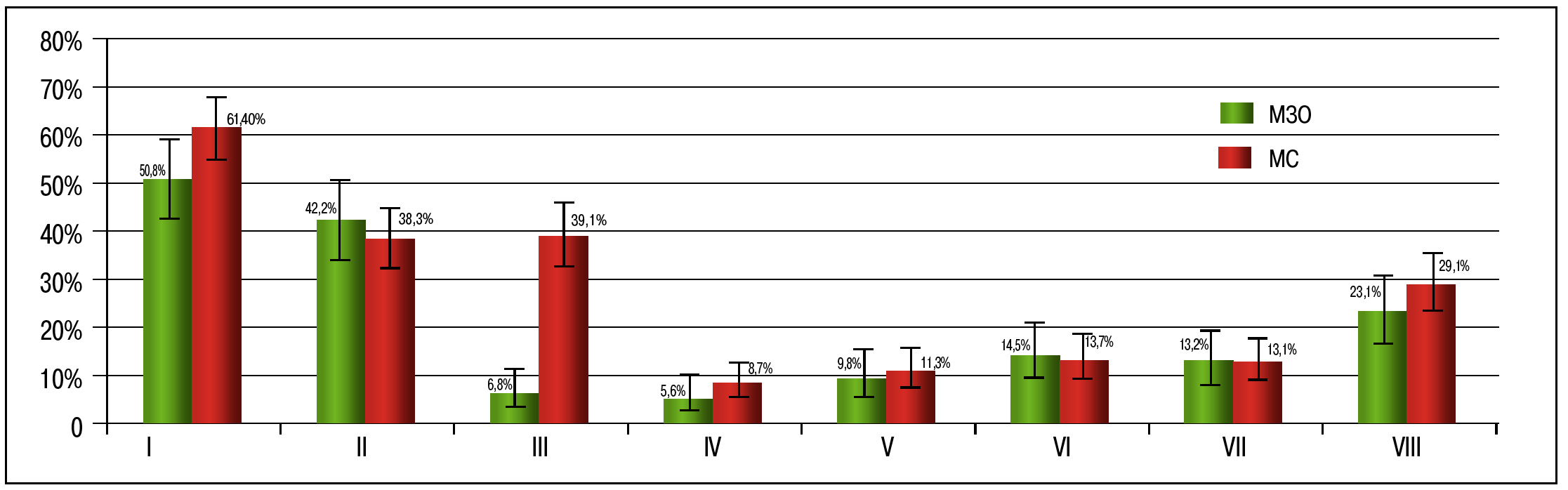 I – гинекологическая патология, II – аллергия, III – нарушения углеводного обмена, IV – заболевания суставов, V – хронические заболевания почек, VI – хронический холецистит, VII – патология желудочно-кишечного тракта, VIII – заболевания щитовидной железы
