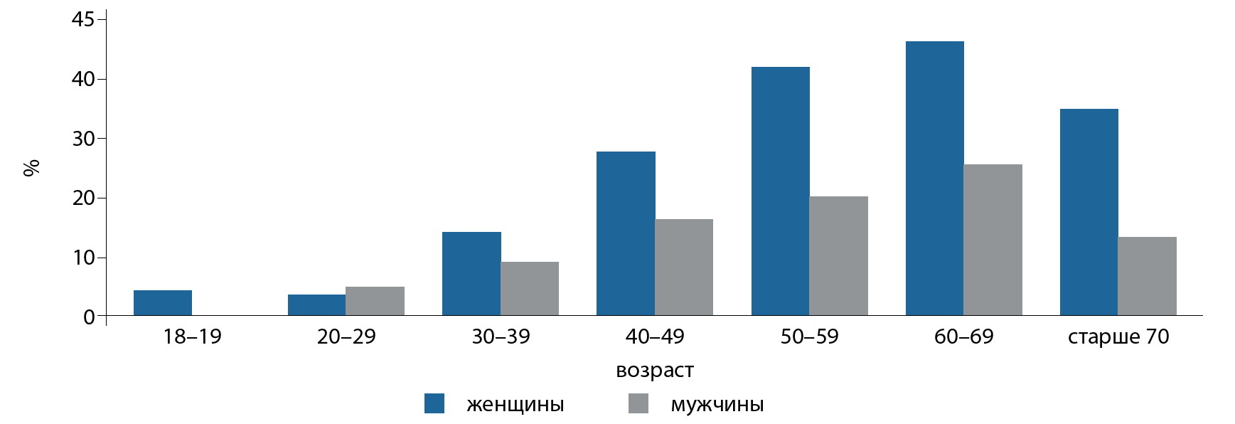 Средний возраст респондентов в выборке (3510 чел.) составил 40 лет (27–54), женщин – 42 года (28–56) и мужчин – 37 лет (26–50) и был значимо меньше, чем в исследуемой группе.