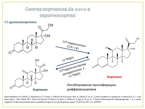 Экспрессия ключевых ферментов стероидогенеза в коже подтверждает предположение о том, что эпидермис может быть основным местом вненадпочечникового синтеза кортизола. Как и ожидалось, ферменты, которые контролируют активность кортизола, а именно конверсию в неактивный кортизон 11b-HSD1 и 11b-HSD2, также экспрессируются множеством подтипов кератиноцитов. Экспрессия CYP11B1 преимущественно выражена в базальных и супрабазальных слоях эпидермиса. Эти слои эпидермиса имеют наибольшую способность к пролиферации и являются основными источниками для регенерации тканей [29].
