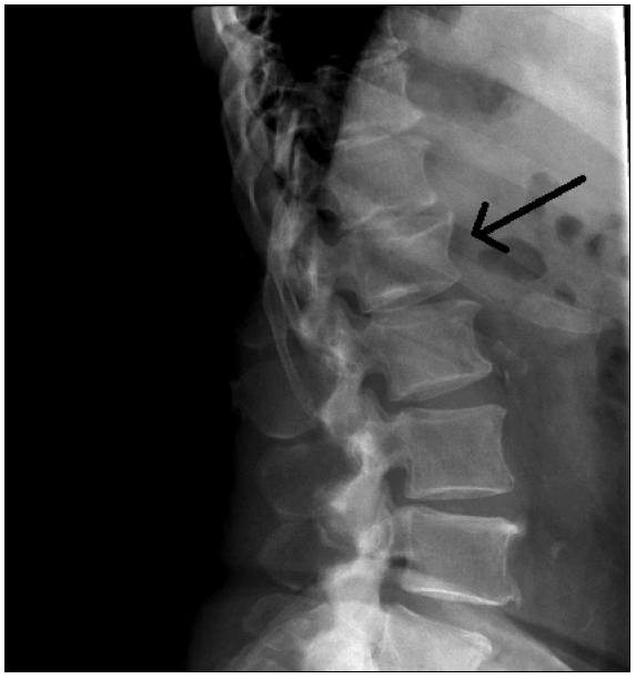 Рис. 1. Компрессионный перелом первого поясничного позвонка на боковой рентгенографии.