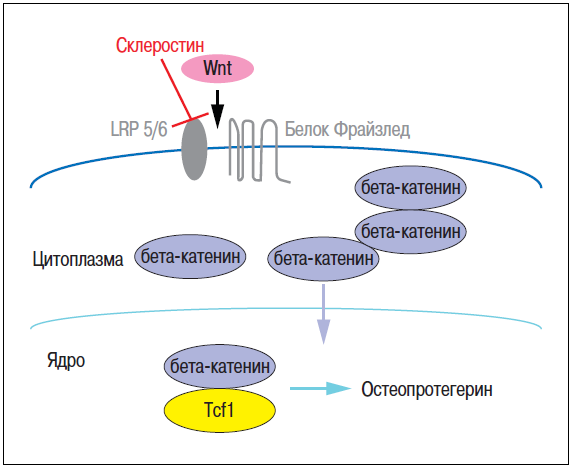 Рис. 2. Сигнальный путь wnt/бета-катенин и его ингибирование склеростином.