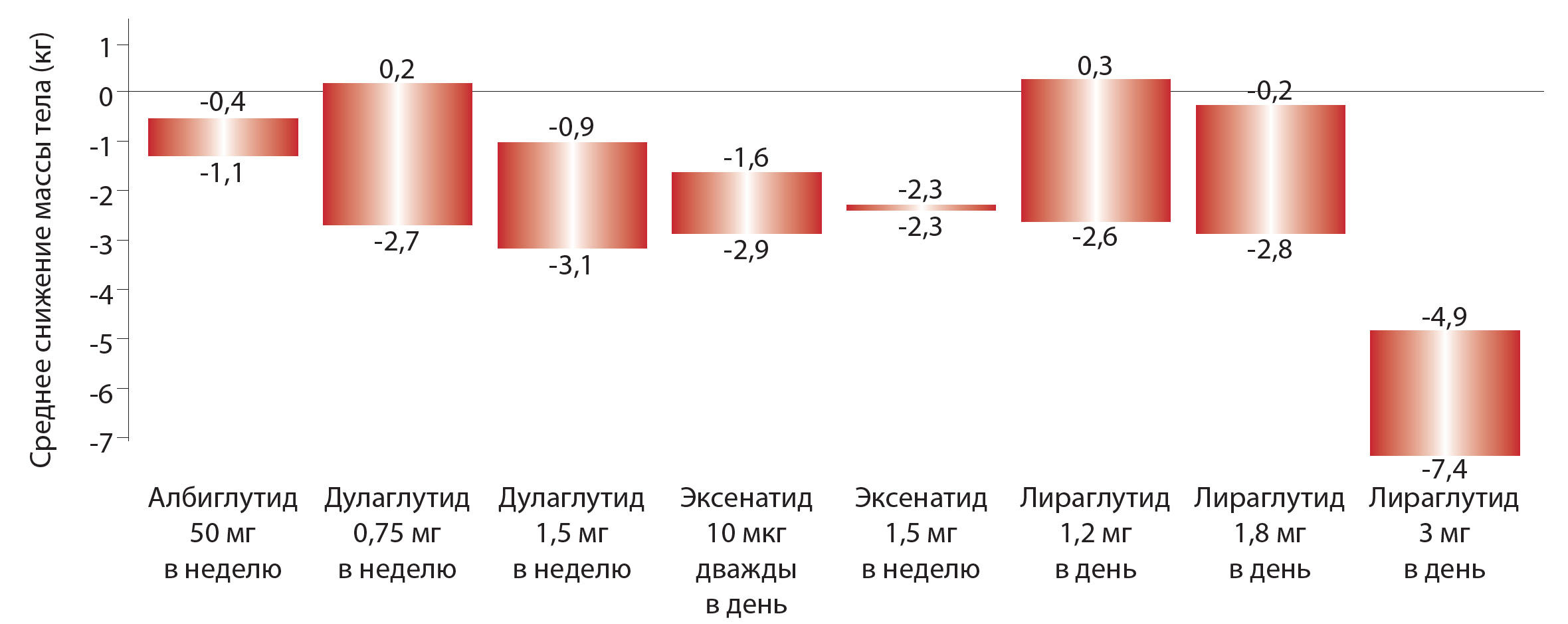 6. Fig. 3. Dynamics of body weight against the background of the use of agonists GLP-1P (adapted from the work of D.Isaacs et al., 2016). | |