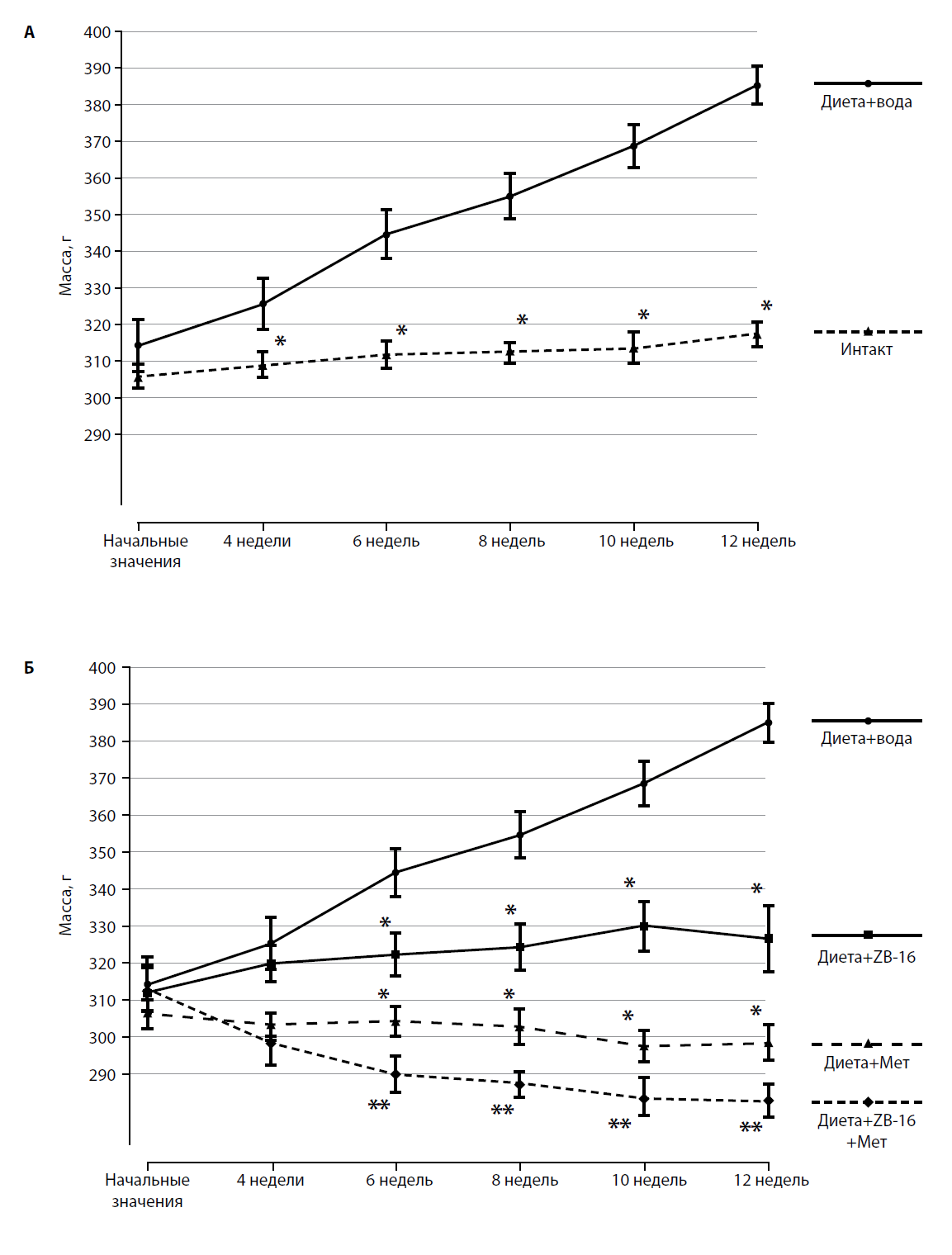 2. Figure 2. The mass of animals kept for 12 weeks in a high-calorie and fat diet and treated with drinking water (A) and ZB-16 with metformin (B). | |