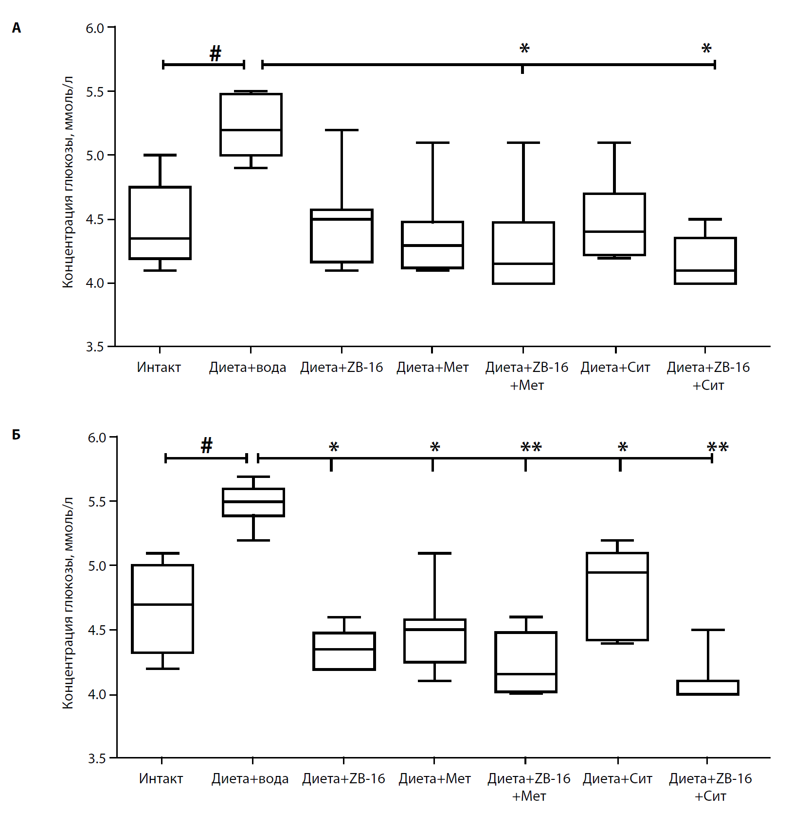 MATERIALS AND METHODS: The study was conducted on 56 outbred female rats aged 7–8 months and an initial weight of 305–320 g. Compound ZB-16 is a highly active GPR119 receptor agonist (EC50 = 7 nM). For 12 weeks, the animals were kept on a high-fat and carbohydrate diet and at the same time received the compound ZB-16, metformin and sitagliptin, or its combination (ZB-16 + metformin and ZB-16 + sitagliptin). During the experiment, the weight of the animals, the mass of feed eaten, as well as the level of glycemia after 6 hours of fasting and with an oral glucose load were assessed.