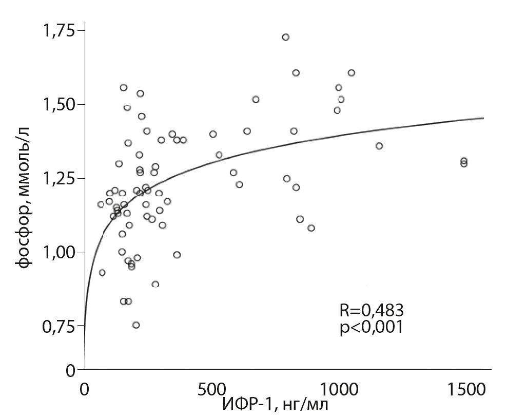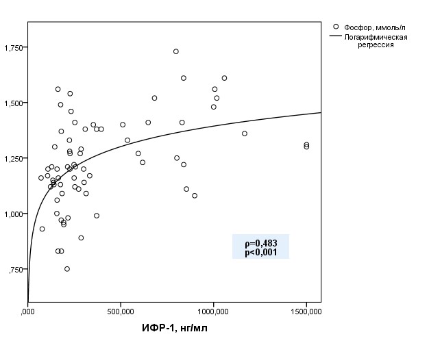 Имеется статистически значимая корреляция между ИФР-1 и фосфором в целом в исследуемой когорте.