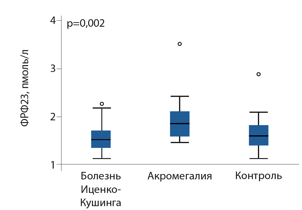 4. Рис. 1. Уровни ФРФ23 у пациентов с болезнью Иценко-Кушинга, акромегалией и здоровых лиц. В группе пациентов с акромегалией отмечается значимое повышение ФРФ23 по сравнению с пациентами с БИК и контрольной группой.
