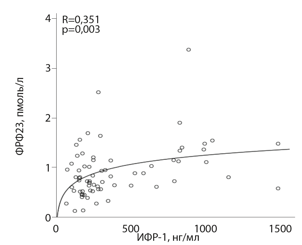 Имеется статистически значимая корреляция между ИФР-1 и ФРФ23 в целом в исследуемой когорте.