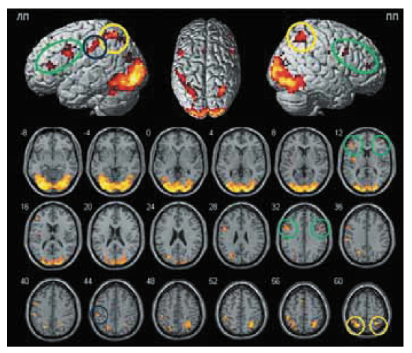 2. Рис. 1. Зоны активации для группы здоровых добровольцев (групповой анализ) при выполнении парадигмы, наложенные на объемное изображение головного мозга (вверху) и срезы в аксиальной проекции (внизу). ПП – правое полушарие большого мозга, ЛП – левое полушарие. Зеленым цветом обозначена ДЛПФК (9 и 46 ПБ), желтым – верхняя теменная долька (7 ПБ), синим – нижняя теменная долька (40 ПБ). Т>6,32, pFWEcorr <0,05. | |
