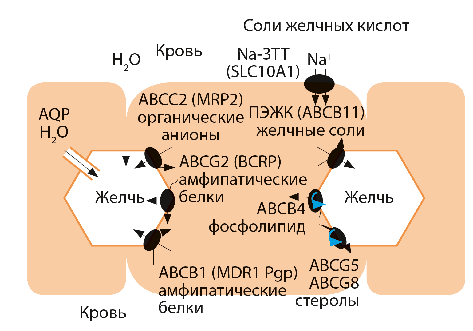 Рис. 1. Схематическое представление наиболее важных транспортных процессов в канальной мембране гепатоцитов, опосредованных транспортными средствами АВС.