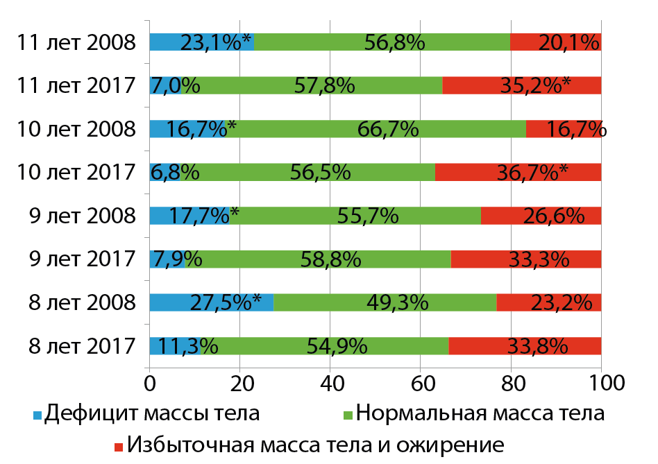METHODSa survey of children aged 8–11 years old residing in the Tyumen region in 2008 (n=390) and in 2017 (n=468) was conducted. The choice of territories in 2008 was carried out by the cluster method in 2008 and in 2017. The studies were conducted by expeditionary method with the departure of a team of doctors in the territory with the measurement of height and body weight and determination of the body mass index (BMI). The results were evaluated according to the SDS BMI guidelines. To compare the frequency of occurrence of qualitative features, the chi-square test (χ²) was used, to compare samples by quantitative characteristics, Student's t-criterion was used. The critical level of significance (p) was checked for statistical hypotheses to be 0.05.
