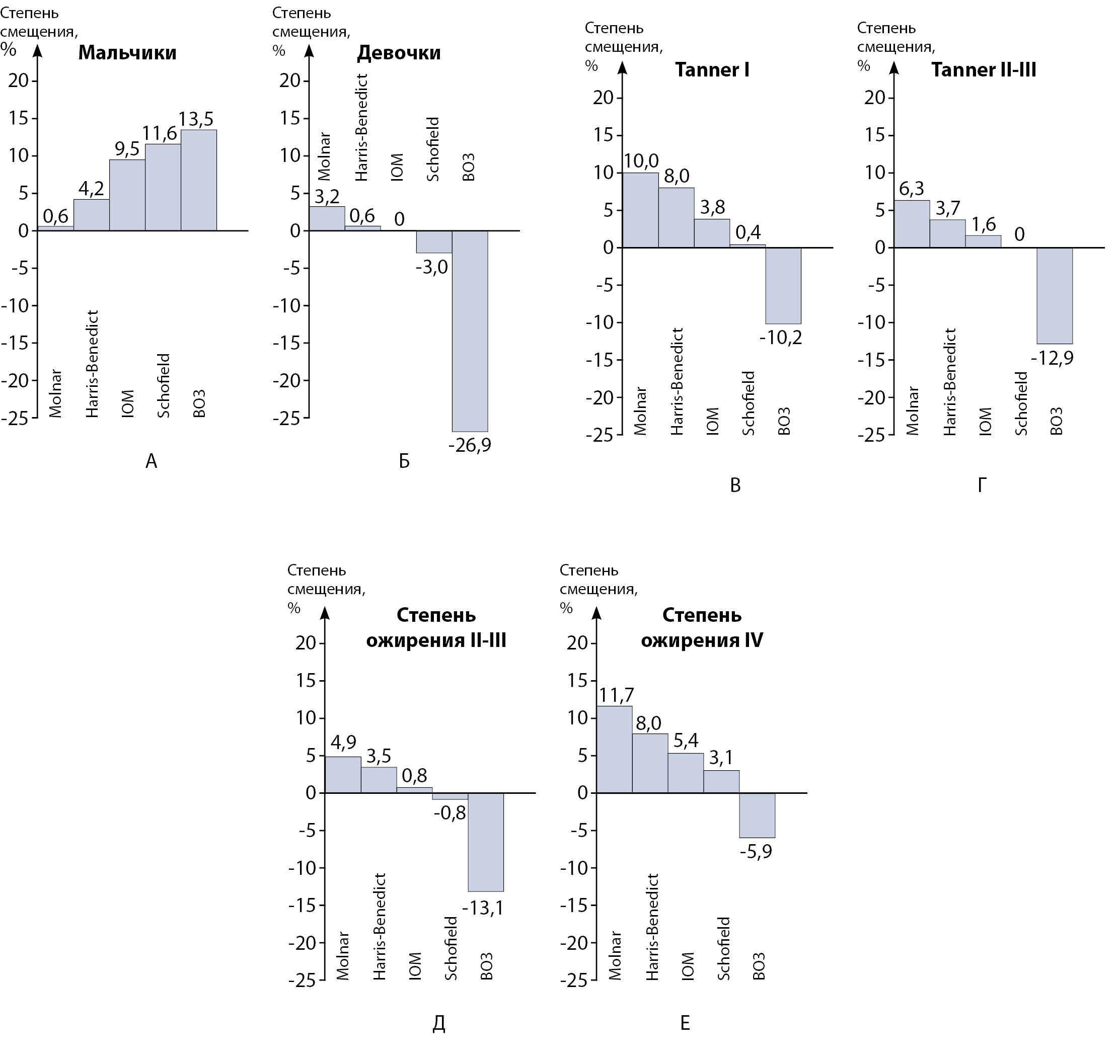 При изучении степени смещения оценки RMR в зависимости от пола продемонстрировано, что у мальчиков все расчетные формулы в разной степени переоценивают основной обмен в покое, но наиболее точными являются формулы Molnar (+0,6%) и Harris–Benedict (+4,2%) (рис. 1, А).