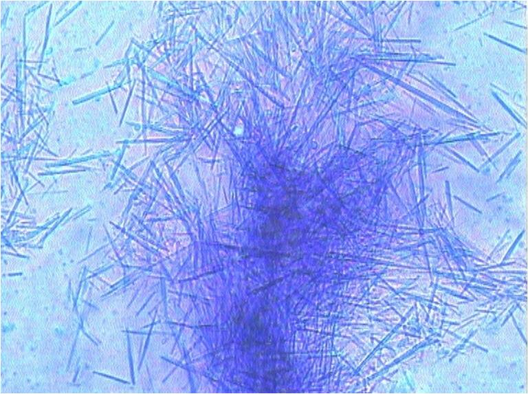 1. Рисунок 1. Поляризационная микроскопия: кристаллы моноурата натрия характерной игловидной формы, обнаруженные в синовиальной жидкости