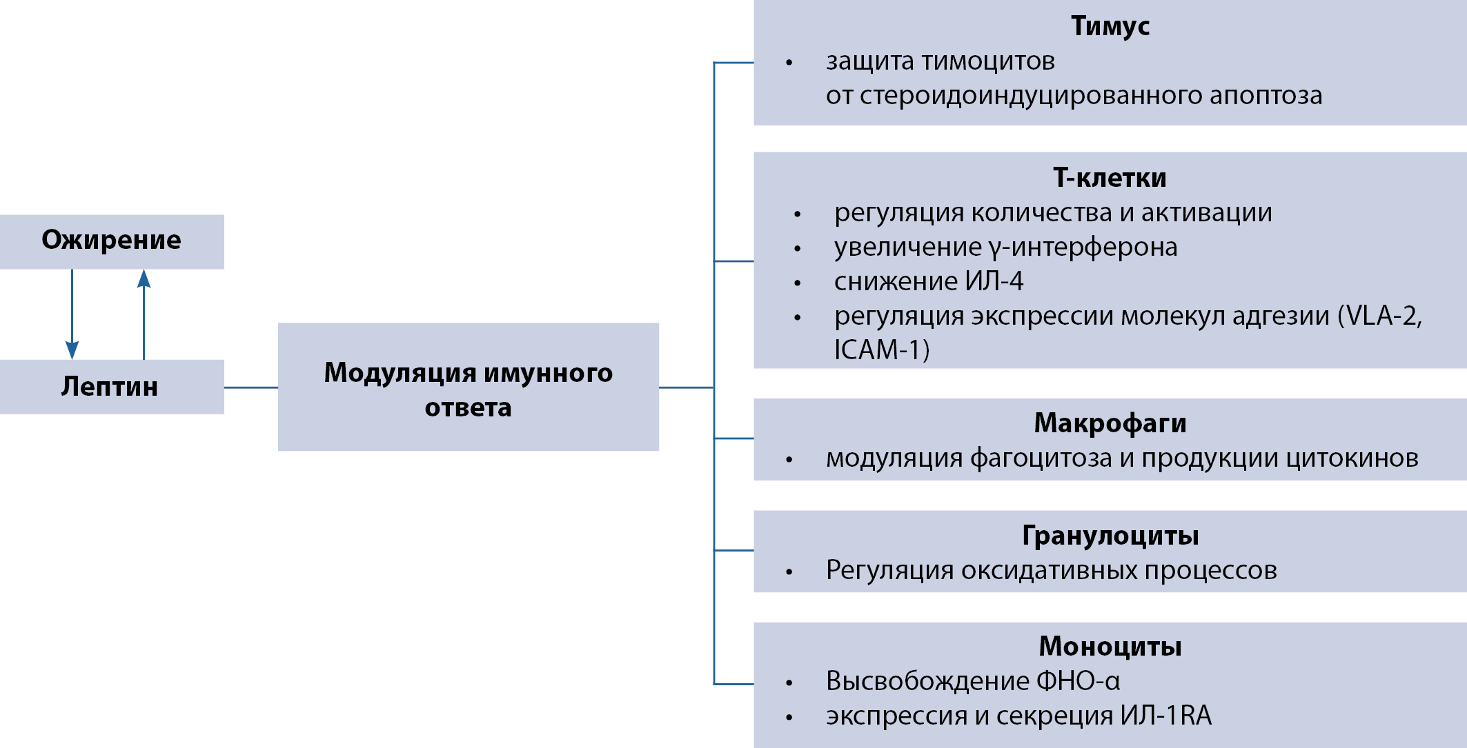 Иммуномодулирующие свойства лептина и некоторых других адипокинов лежат в основе нарушений в системе гуморального и клеточного иммунитета у лиц с избыточным весом и Ож [68] (рис. 1).