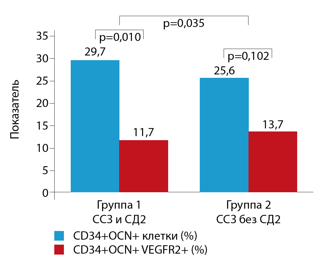 METHODS: We observed patients with CVD (coronary artery disease and / or chronic limb threatening ischemia) with T2DM and without T2DM. Patients with CVD and T2DM were included in group 1 patients with CVD and without T2D were included in group 2. The level of CD34 + VEGFR2 cells and CD34 + OCN+ cells was determined by flow cytometry.There were no differences in the age, gender, lipid profile, body mass index, creatinine clearance, myocardial revascularization and lower limb revascularization between the 2 groups.The level of CD34 + VEGFR2 cells and CD34 + OCN+ cells was determined by flow cytometry. The number of cells was determined by a percentage of the number of CD34+ cells.