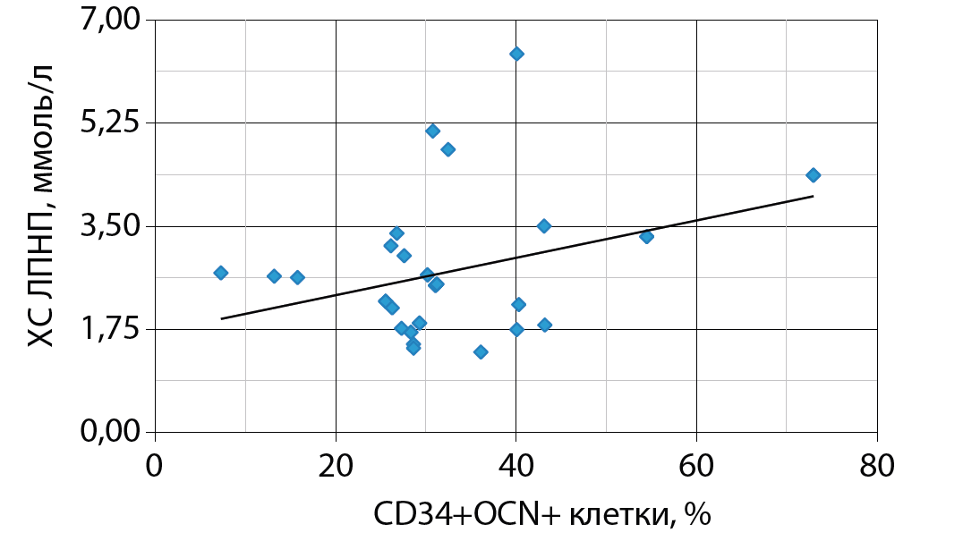 2. Fig. 2. Correlation of low-density lipoprotein cholesterol and the content of CD34 + OCN + cells in patients with type 2 diabetes. | |