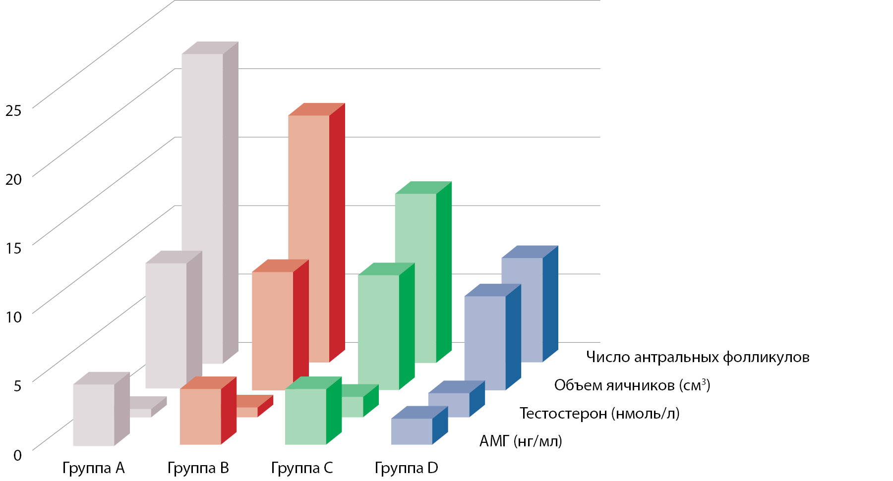 Уровни АМГ, ингибина В, ФСГ, ЛГ, эстрадиола, тестостерона, прогестерона определялись методом усиленной люминесценции. Для оценки объема яичников и числа антральных фолликулов проводилось трансвагинальное ультразвуковое исследование (УЗИ) на ультразвуковом аппарате Hewlett Packard Image Point (США) с использованием вагинального датчика с частотой 3,5 МГц по общепринятой методике. Референсные значения определялись на основании данных локальной лаборатории, а также с учетом рекомендаций Американской коллегии акушеров-гинекологов по определению овариального резерва 2015 г. [8] и Роттердамских критериев синдрома поликистозных яичников (СПКЯ) (для определения нормального объема яичника) [9].