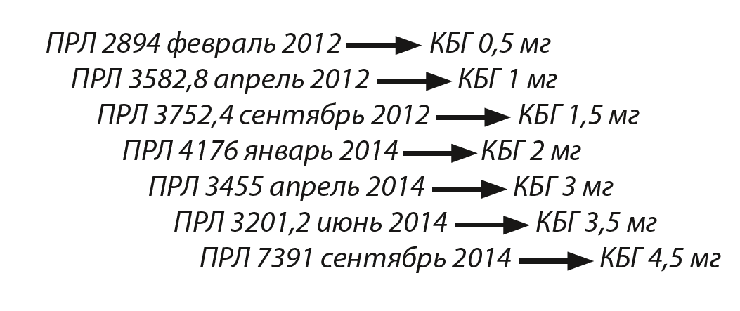 4. Fig. 3. Dynamics of PRL level and titration of cabergoline dose (per week). | |