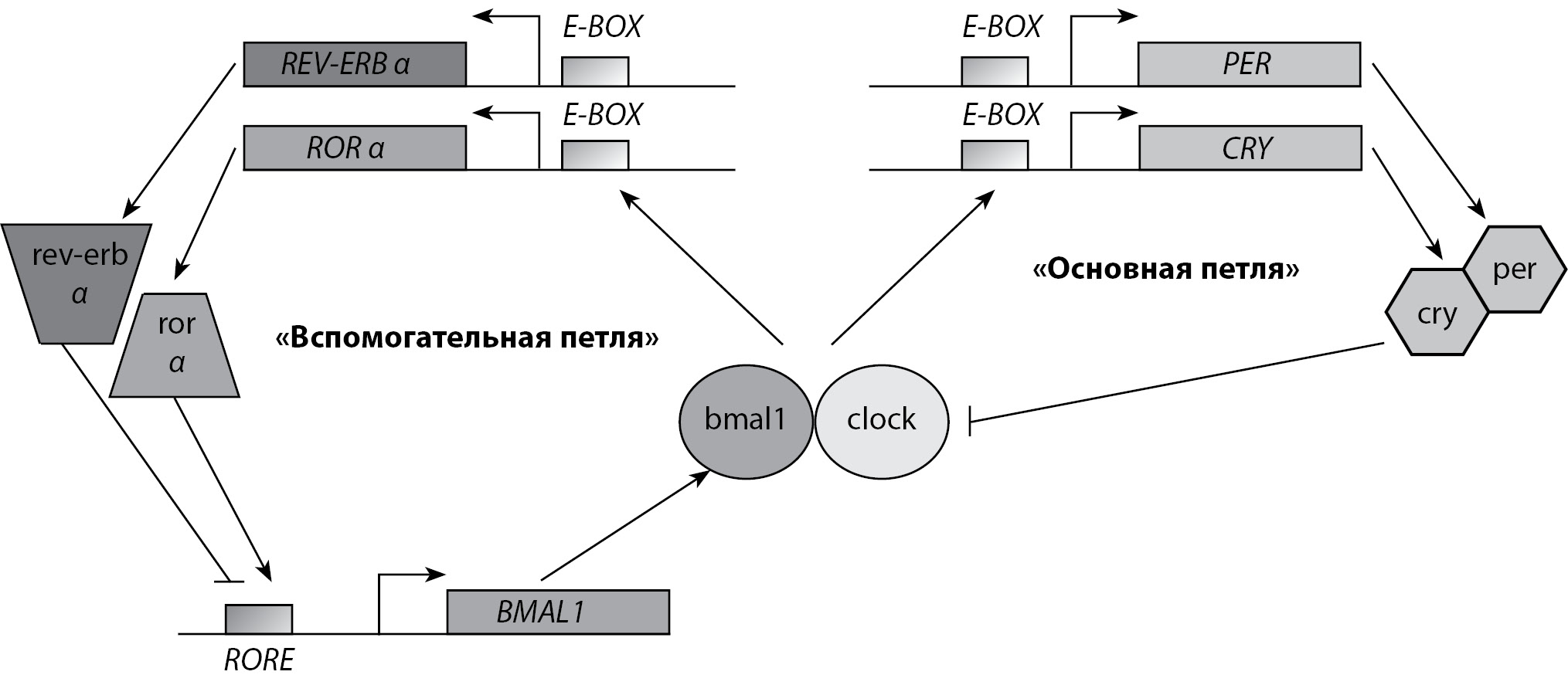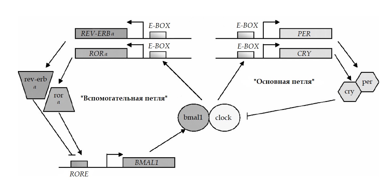 CLOCK – ген сircadian locomotor output cycles kaput; BMAL1 – ген brain and muscle aryl hydrocarbon receptor nuclear translocator-like; PER – периодические гены (PERIODS); CRY – криптохромные гены (CRYPTOHROMES); REV-ERB – ядерные рецепторы, ROR – ретиноид-связанные орфанные рецепторы. В циркадианных часах выделяют две транскрипционные петли: «основную» и «вспомогательную». Гены, входящие в «основную транскрипционную петлю», – CLOCK, BMAL1, PER и CRY, – и продукты их транскрипции (clock, bmal1, per, cry) представляют собой саморегулирующуюся основу циркадианных часов. Гетеродимеры clock/bmal1 связываются с E-бокс-последовательностью генов PER и CRY, что инициирует их транскрипцию. Образующиеся в результате этого мРНК транслируются в цитоплазме клеток в белки per и cry. Гетеродимеры per/cry ингибируют активатор комплекса BMAL1/CLOCK, тем самым подавляя собственную транскрипцию. Per-cry комплексы затем разрушаются казеинкиназой 1, супрессия CLOCK/BMAL1 генов завершается.