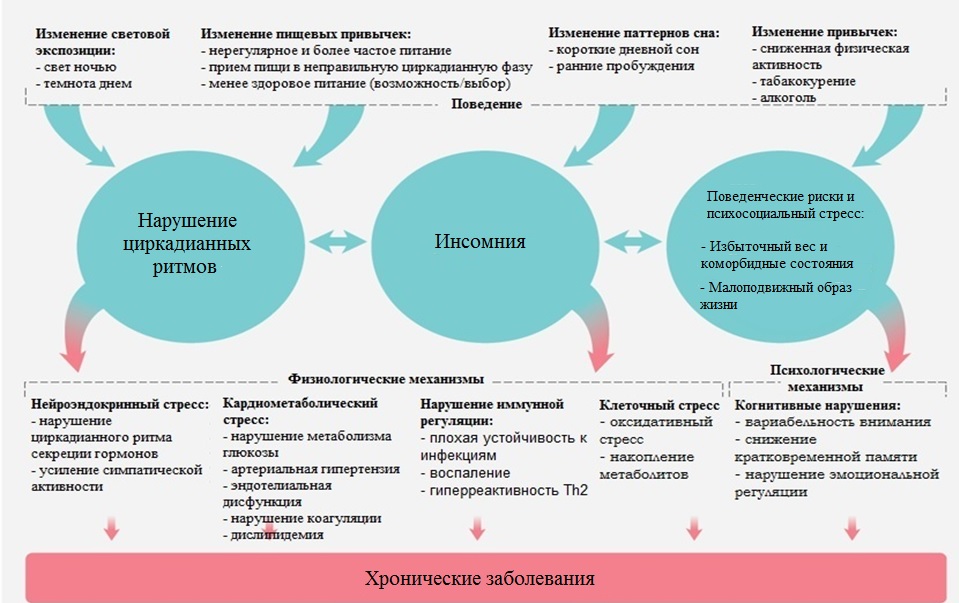 Лица, работающие посменно, сталкиваются с конфликтующими таймерами: изменения во времени приема пищи и активности сигнализируют периферическим органам о необходимости синхронизации с иным циркадианным ритмом, а искусственное освещение ночью влияет на ритм СХЯ, как и яркий дневной свет днем. Более того, ротация смен может приводить к тому, что эндогенные циркадианные часы хронически не совпадают с часами активности. Кроме того, периферические биологические часы десинхронизируются в зависимости от того, как конфликтующие друг с другом таймеры воспринимаются разными тканями, – происходит разлад в часовой мастерской. Предполагается, что у работающих посменно циркадианная десинхронизация, инсомния и нарушения поведенческих реакций вызывают хронические заболевания (рис. 3). В том числе длительная работа в ночную смену (>20 лет) ассоциирована с увеличением риска рака молочной железы [39], рака простаты [40, 41] и колоректального рака [42].