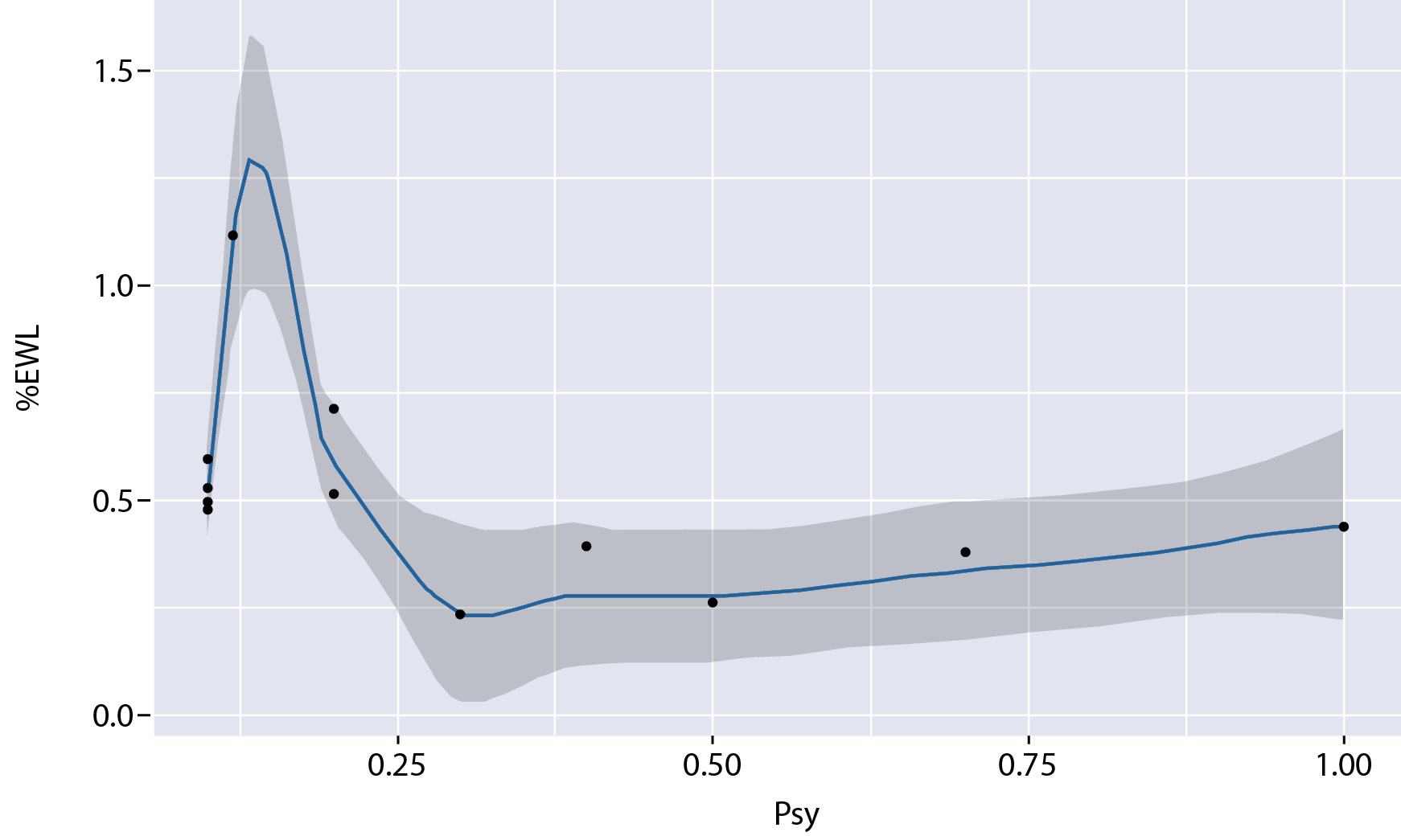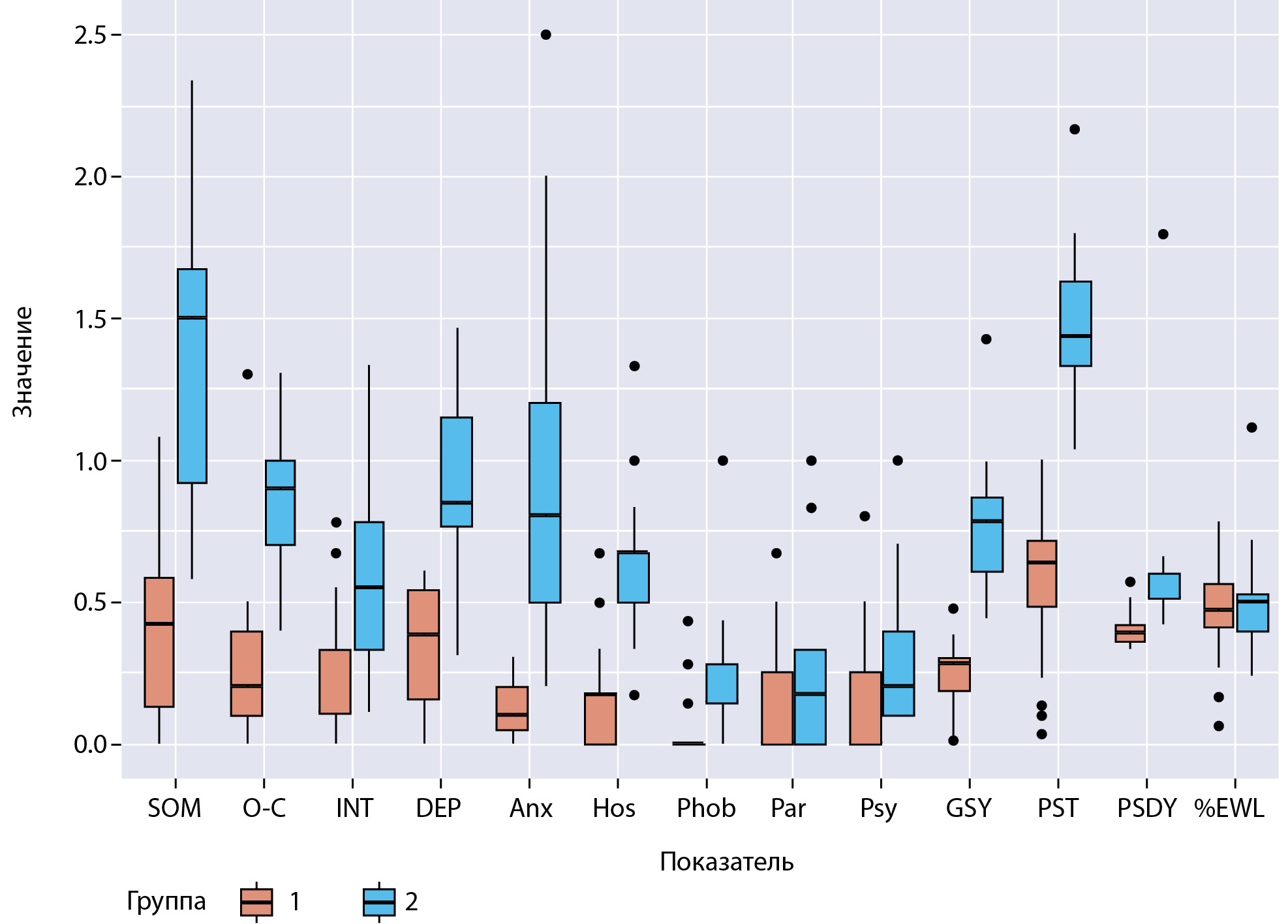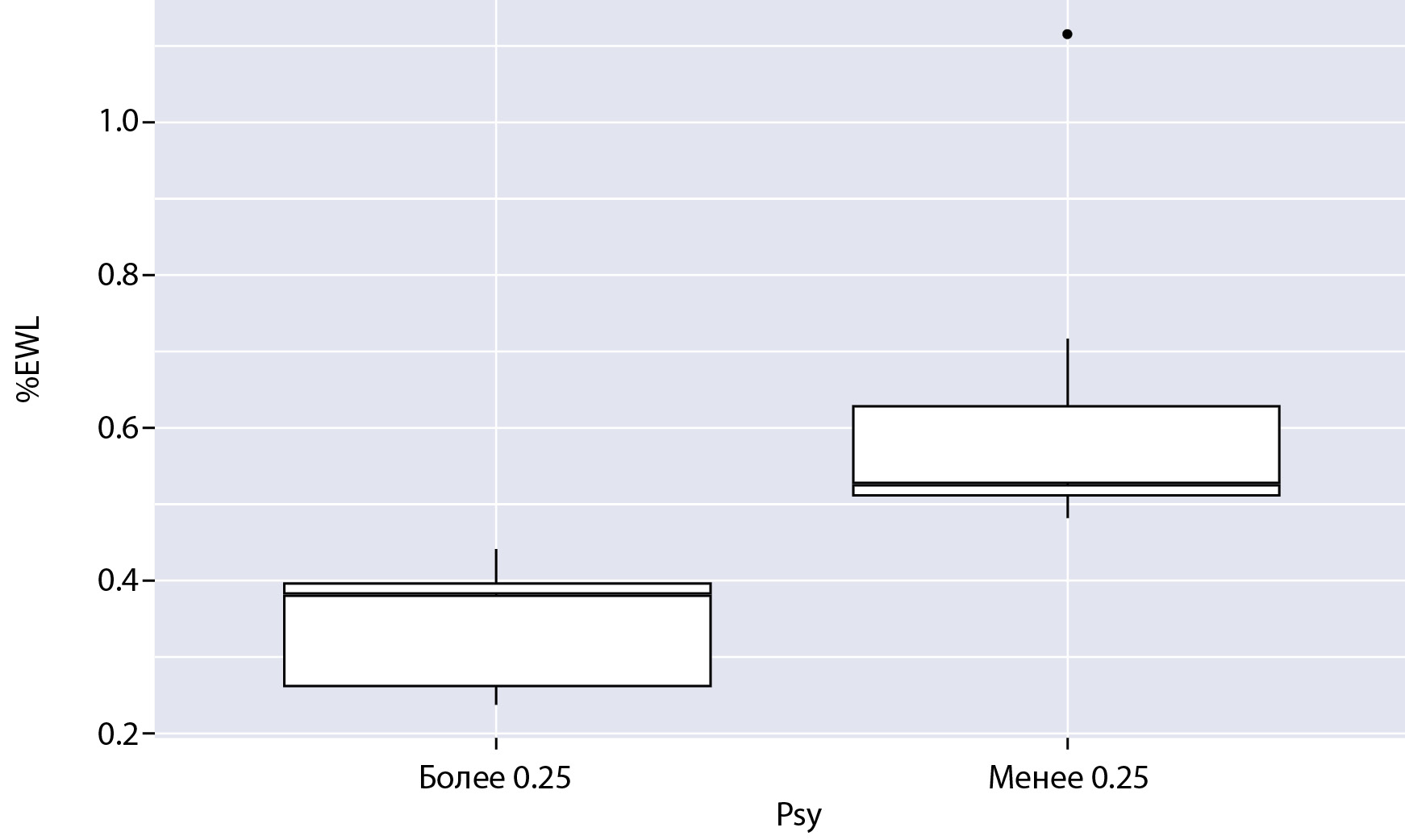 Фактически коэффициент корреляции показал, что, исходя из имеющихся данных, малые значения по шкале «психотизм» (Psy) соответствуют большему проценту потери веса (%EWL) (приблизительно от 0,5 до 1,2), начиная со значения 0,25 – около 0,3. Действительно, если использовать данное деление, то для 2 группы различия значимы (W=178,5; p-value=0,006, рис. 4).