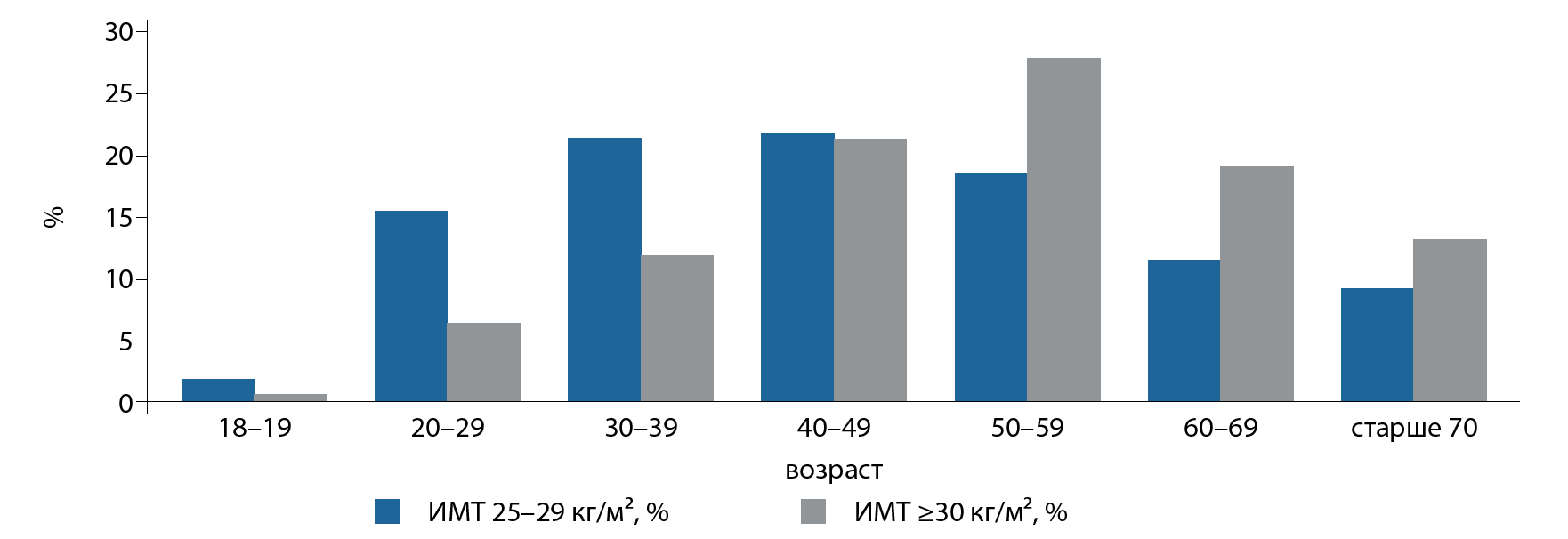 Conclusions. In the adult population of Irkutsk, we found a significant prevalence of overweight and obesity and determined its sex and age characteristics.