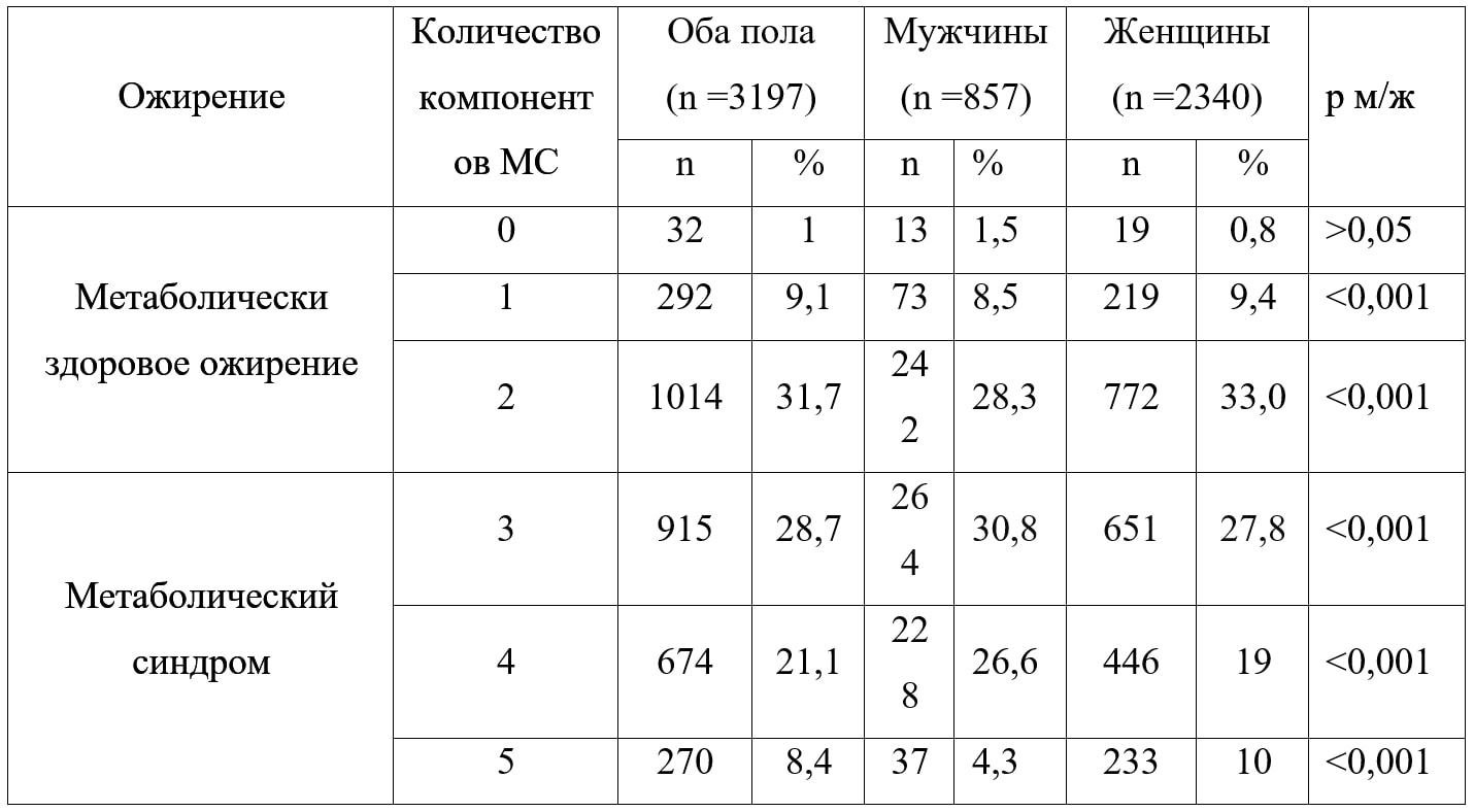 «Метаболически здоровое ожирение» определялось как ожирение (ИМТ ≥30 кг/м²) с наличием 2 и менее компонентов МС по критериям NCEP ATP III.