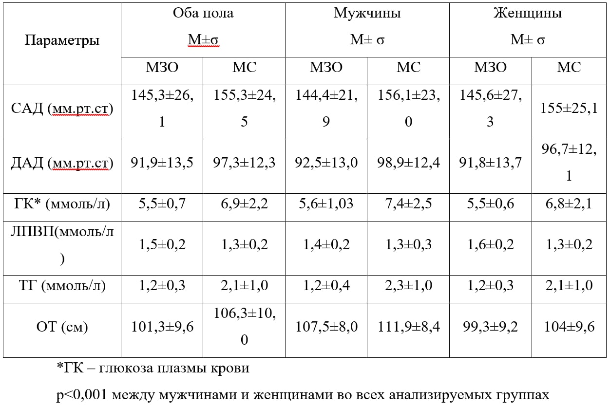 Результаты. Распространенность МЗО составила 41,8% (38% у мужчин и 43% у женщин). Обследованные с МЗО имеют достоверно более низкий средний уровень триглицеридов (ТГ), холестерина липопротеидов высокой плотности (ХС-ЛПВП), показателей глюкозы крови, систолического артериального давления и диастолического артериального давления и меньшую окружность талии, чем в группе с МС. В группах МЗО и МС абдоминальное ожирение распространено у мужчин в 95% и 71%, у женщин – в 99% и 90%, гиперТГ у мужчин в 74% и 9%, у женщин в 72% и 5,5%, гипо-ХС-ЛПВП в 16% и 1% у мужчин и в 44,5% и 3% у женщин, АГ в 96% и 77% и 94% и 71% у мужчин и женщин соответственно, выраженно отличалась частота гипергликемии натощак – 77% и 21% у мужчин и 60% и 5% у женщин.